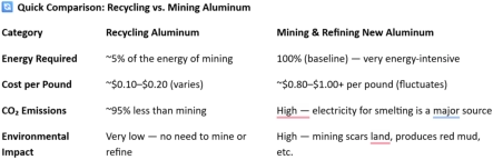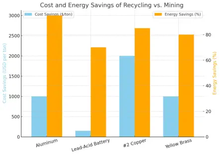 Recycling vs. Mining – Savings Comparison SheetAluminum•Money Saved: Up to $1,000+ per ton•Energy Saved: ~95%•Why It Matters: Mining bauxite is extremely energy-intensive. Recycling aluminum is fast, efficient, and low-waste.Lead-Acid Batteries•Money Saved: $100–$160 per ton•Energy Saved: ~65–75%•Why It Matters: 95% of a lead-acid battery is recyclable. Recycling reduces hazardous waste and costs.#2 Copper•Money Saved: $1,500–$2,500 per ton•Energy Saved: ~85–90%•Why It Matters: Copper recycling keeps valuable metal in circulation with minimal environmental impact.Yellow Brass•Money Saved: $3,000–$5,000 per ton•Energy Saved: ~75–85%•Why It Matters: Brass is a mix of copper and zinc — both expensive to mine. Recycling retains metal value and lowers processing costs significantly.